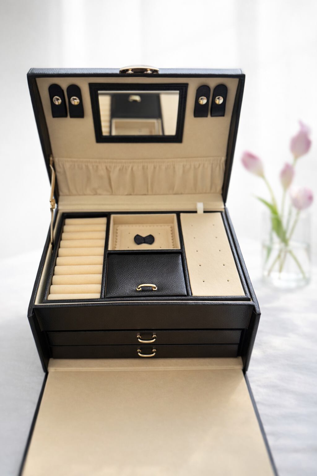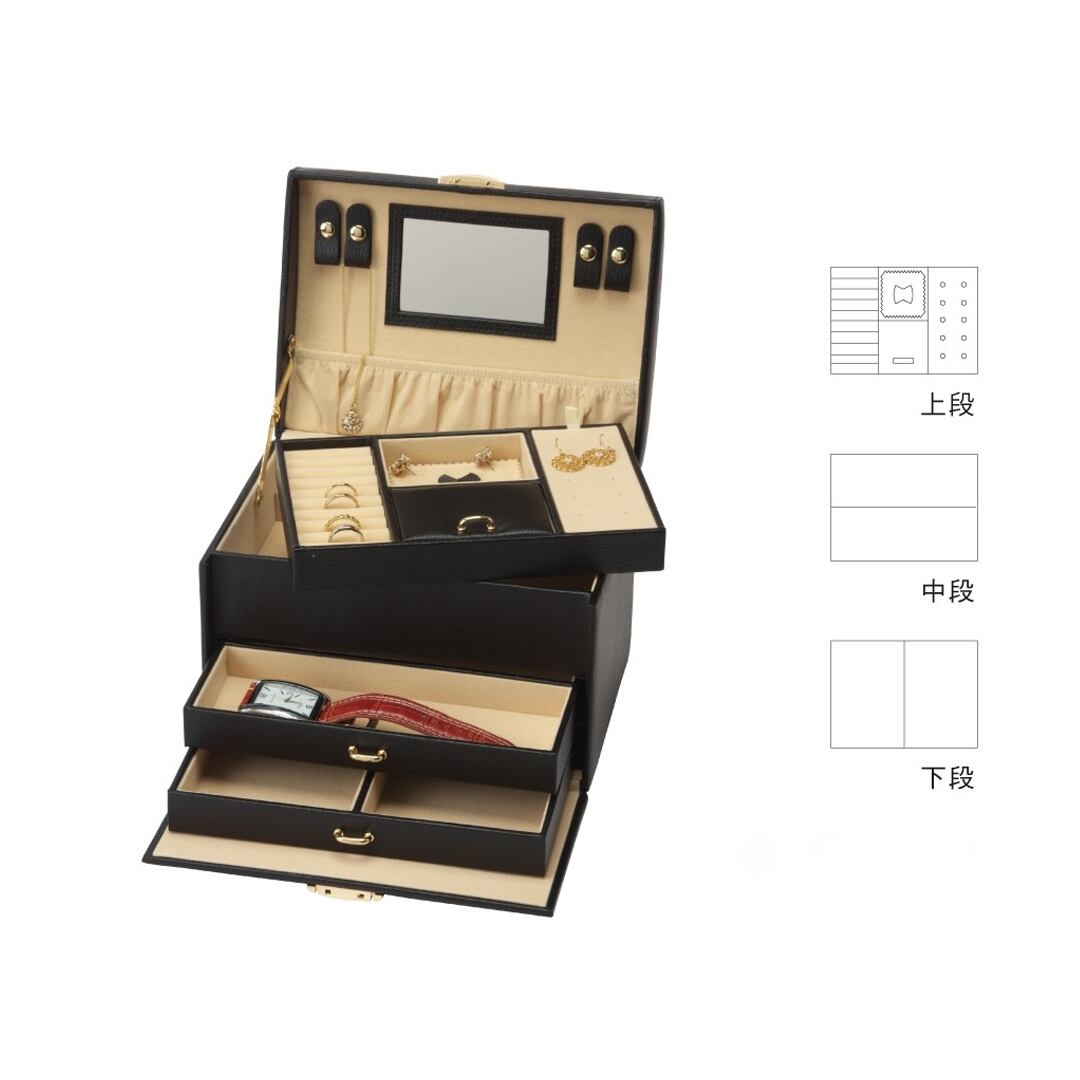 上質な佇まいと機能性を兼ね備えた、三段構造のジュエリーボックス。